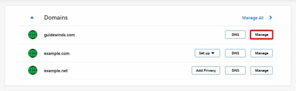 第1步: 登录您的Godaddy帐户后,点击 管理 您要用于私人名称服务器的域名旁边。